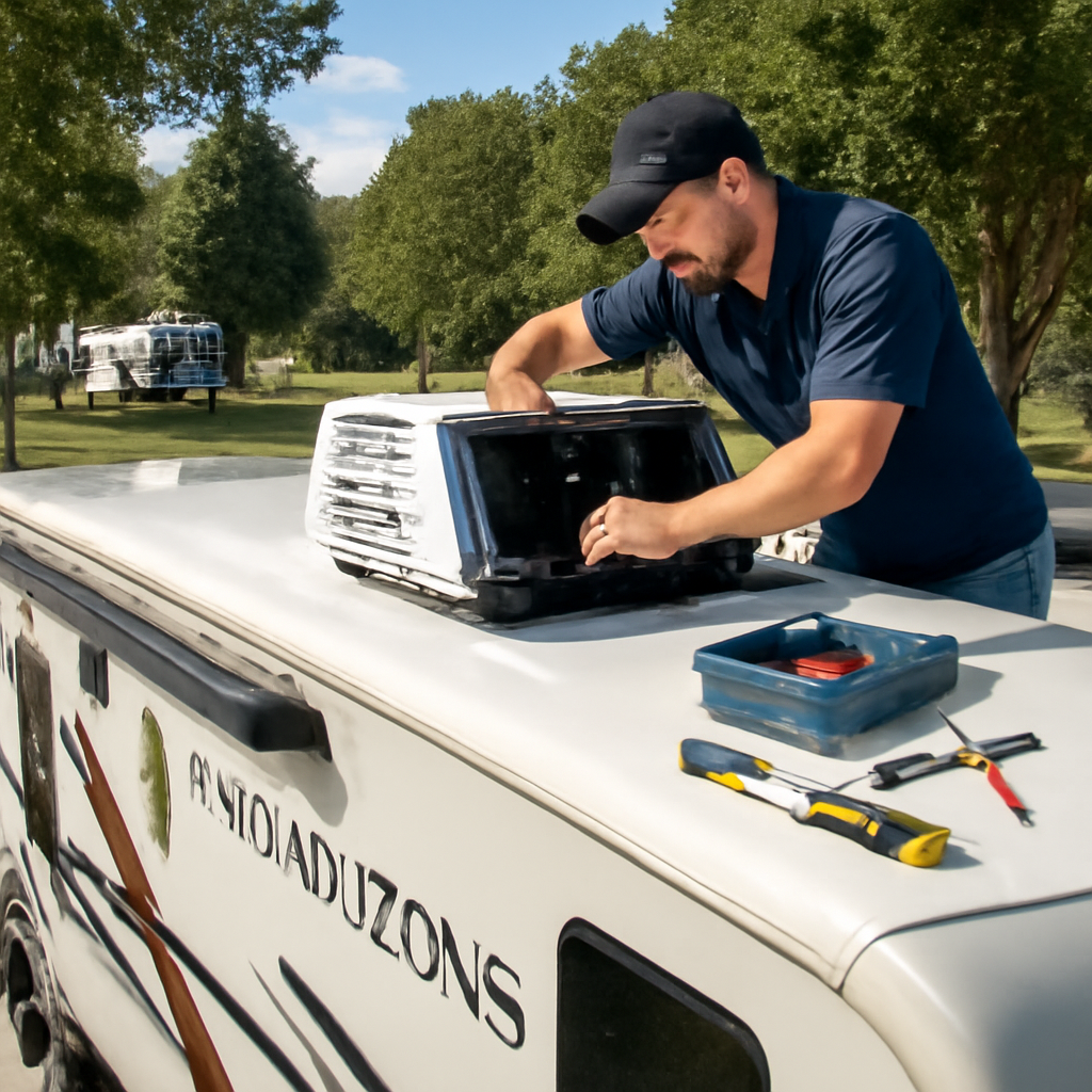 Climb onto your RV roof safely using a ladder and secure footing, then locate the four to six bolts holding the AC shroud in place. Carefully unbolt and lift off the outer cover to expose the dual run capacitor, fan motor, and internal coils underneath.